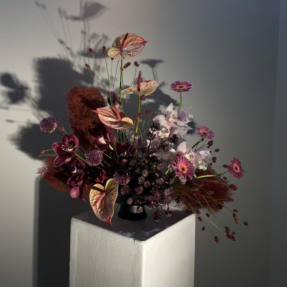 Like an autumn day captured indoors, this two-vase arrangement layers seasonal depth and texture. With warm-toned gerberas, sculptural anthuriums, and exotic cymbidiums set against moss and dried florals, it evokes the richness of fall. Designed to bring warmth and sophistication into any space, Enchanted Floral is the perfect statement piece for celebrating the cosy elegance of the season in Dubai.