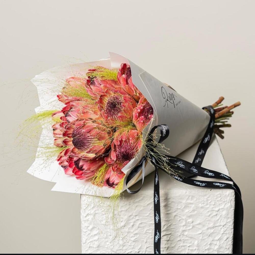 Striking and unforgettable, this bouquet showcases 14 premium proteas — flowers known for their strength, resilience, and exotic beauty. Expertly arranged with elegant wrapping and ribbon, and presented in a chic gift bag, Protenian Lady makes a bold statement of admiration and confidence. Perfect for celebrating milestones, expressing gratitude, or gifting something truly extraordinary.