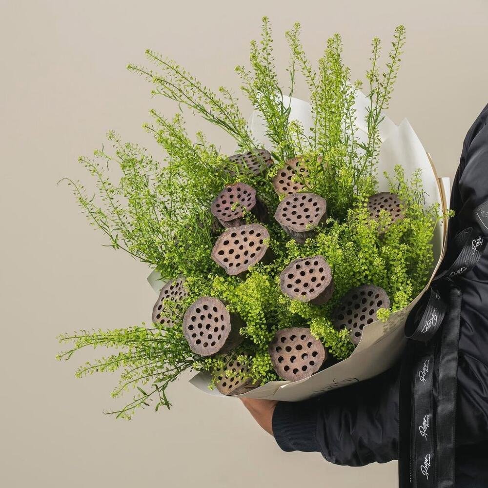 Inspired by the earthy elegance of the season, this striking bouquet blends natural textures and warm tones. Featuring 10 delicate lotus pods and lush greenery, it captures autumn’s quiet beauty in a contemporary design. Wrapped with care and finished with a ribbon and gift bag, it’s a versatile choice for expressing gratitude, celebrating milestones, or adding seasonal charm to any space.