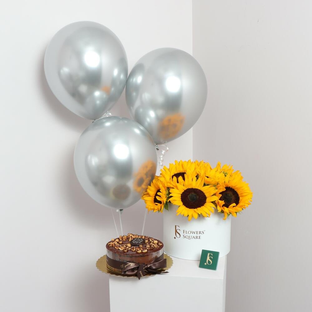 Got a Libra to spoil this October? This set has it all: sunny blooms, luscious hazelnut fudge cake, and silver balloons that float like stardust. A gift that’s as charming as their star sign.