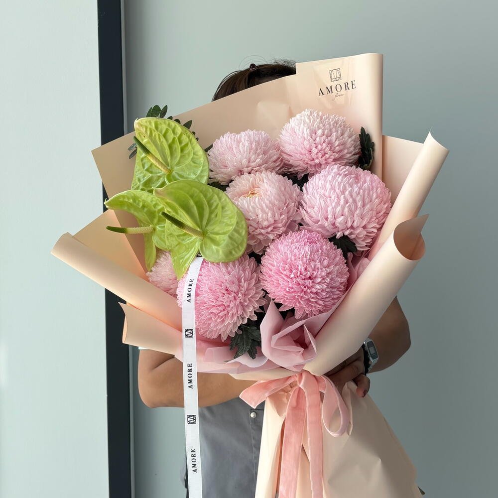 A flirty mix of pink dahlias and juicy green anthuriums, this bouquet is full of character. Bursting with colour and texture, this floral feast for the eye is made for someone with a big personality and a touch of whimsy.