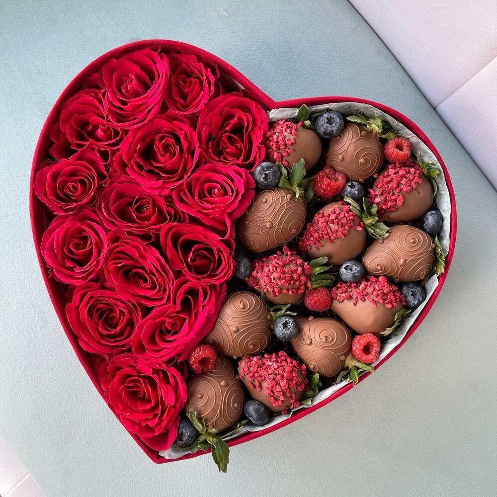 Classic, sweet, and undeniably romantic, chocolate-dipped strawberries in a heart-shaped box never disappoint. Now add red roses to the mix! This combination is like you two — a perfect couple.