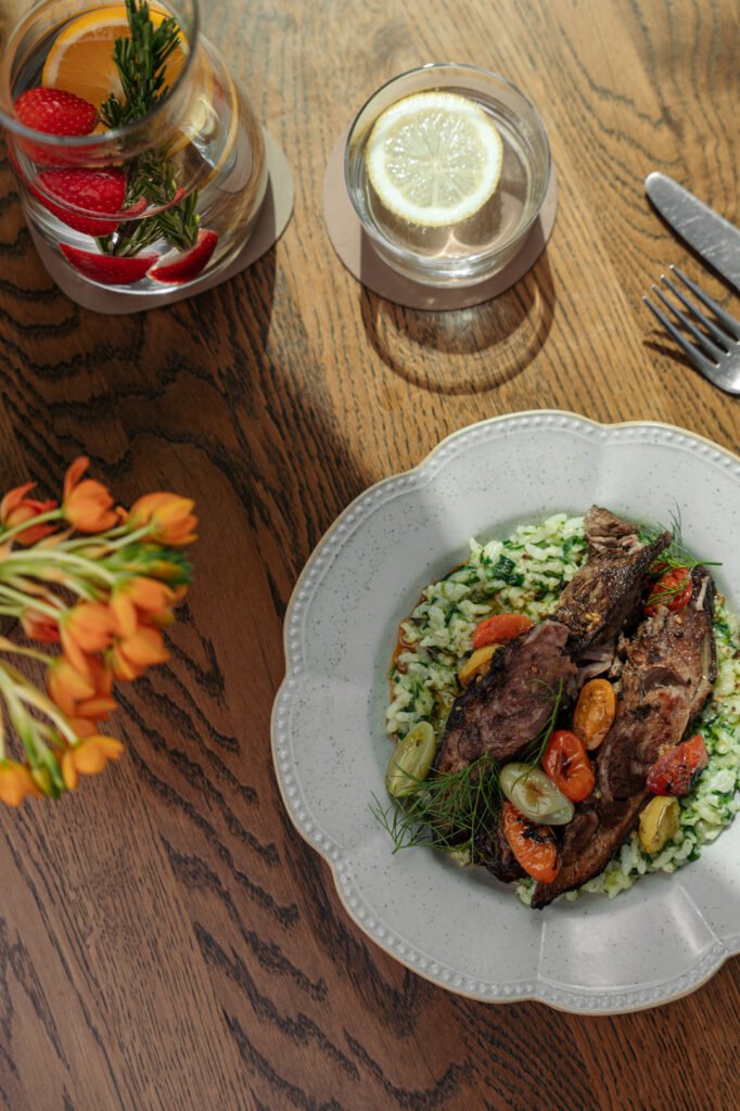 For something lighter, the gyros chicken (AED 95) is marinated in yogurt and spices, then paired with lemon sauce and herbs. For something more substantial, the roasted lamb (AED 125) slow-cooked with garlic, paprika and herbs, served with creamy biryan rice and roasted cherry tomatoes can never disappoint.