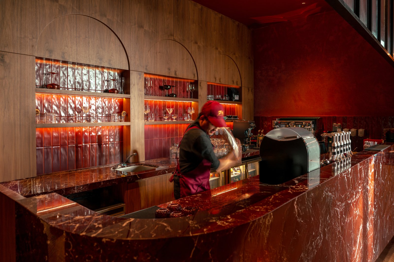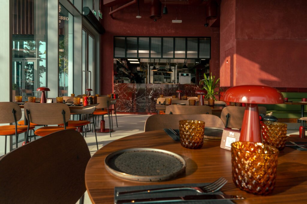 Bathed in natural light through towering glass walls, 71 Steak & Grill in Nad Al Sheba blends earthy tones, lush greenery, and cinematic design accents. With terracotta-coloured ceilings, amber glassware, and sculptural statement pieces, the restaurant offers an atmosphere that is both stylish and welcoming.