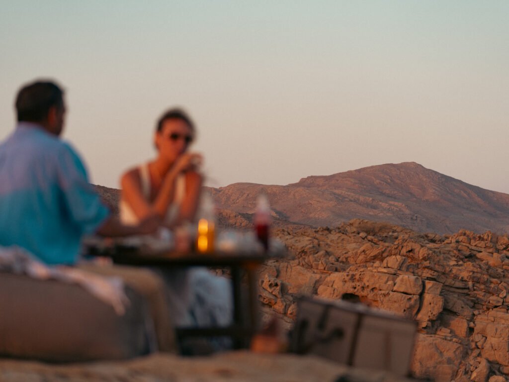The journey begins long before arrival. Guests are collected from their home, hotel, or directly from the airport in a comfortable vehicle and driven to Fujairah, as city roads gradually give way to open landscapes and mountain terrain. From there, an off-road vehicle takes guests on a winding ascent into the mountains, all the way to the top. By the time Parvara comes into view, the experience has already begun.