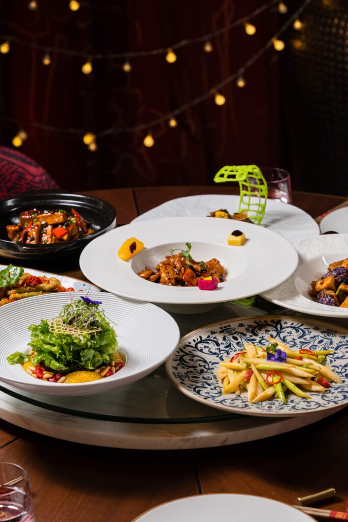 Guests can choose between two specially crafted menus priced at AED 400 and AED 600. Highlights from the AED 400 menu include crispy duck salad, tiger prawn chang fen, kung pao sole fish, and wagyu beef with peppers, balanced with vibrant vegetarian dishes like wok-stirred vegetable fried rice and Singapore noodles. For dessert, a festive “Christmas Tree” creation and pineapple carpaccio bring a sweet and seasonal finish.