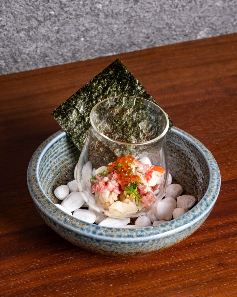 The journey begins with Hassun Appetizer Platter, setting the tone for the evening with a refined introduction. This is followed by Jewel in a Cup, a delicate course designed to capture the thrill of discovery. For the third course guests may choose between Kimchi Soup or Black Garlic Gyoza Soup, offering warmth and depth before moving into the heart of the experience.