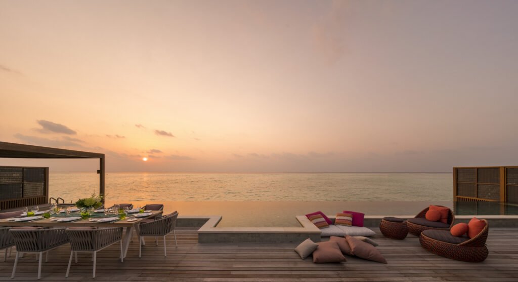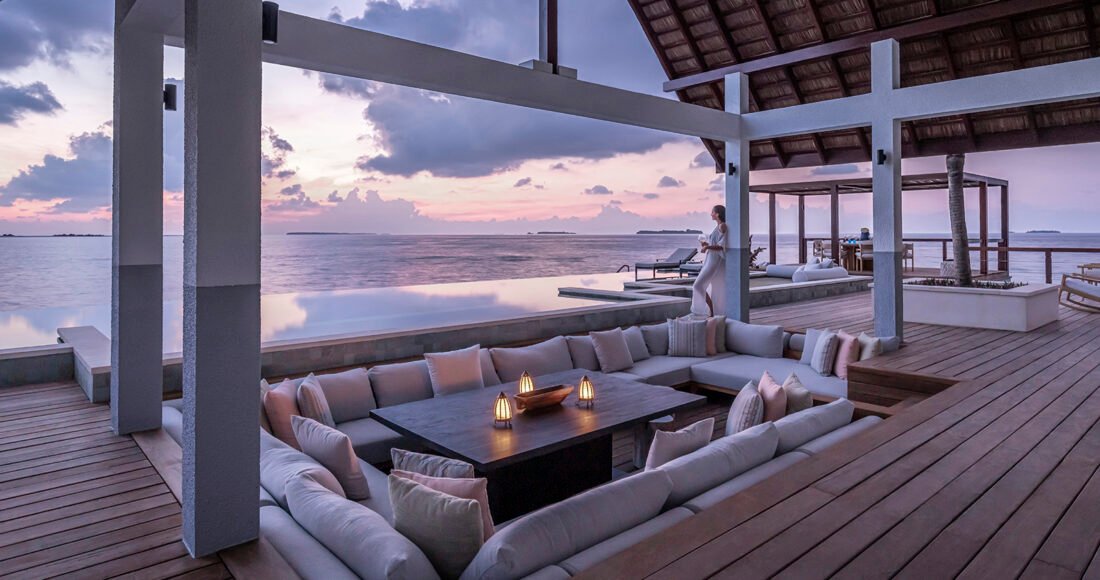For those who dream of horizon-to-horizon views, the Three-Bedroom Water Suite, available with sunrise or sunset orientations, delivers the epitome of overwater living. Its vast decks, semi-submerged loungers, and panoramic sea vistas – an ideal haven for couples or friends seeking a peaceful festive retreat.