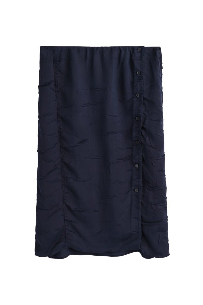 In womenswear, dresses introduce softness and movement, offsetting the tailored foundation with fluid silhouettes defined by crinkled textures and lingerie-inspired detailing. Shirting is elevated through delicate ruffles, bringing a sense of femininity and refinement to the modern wardrobe.