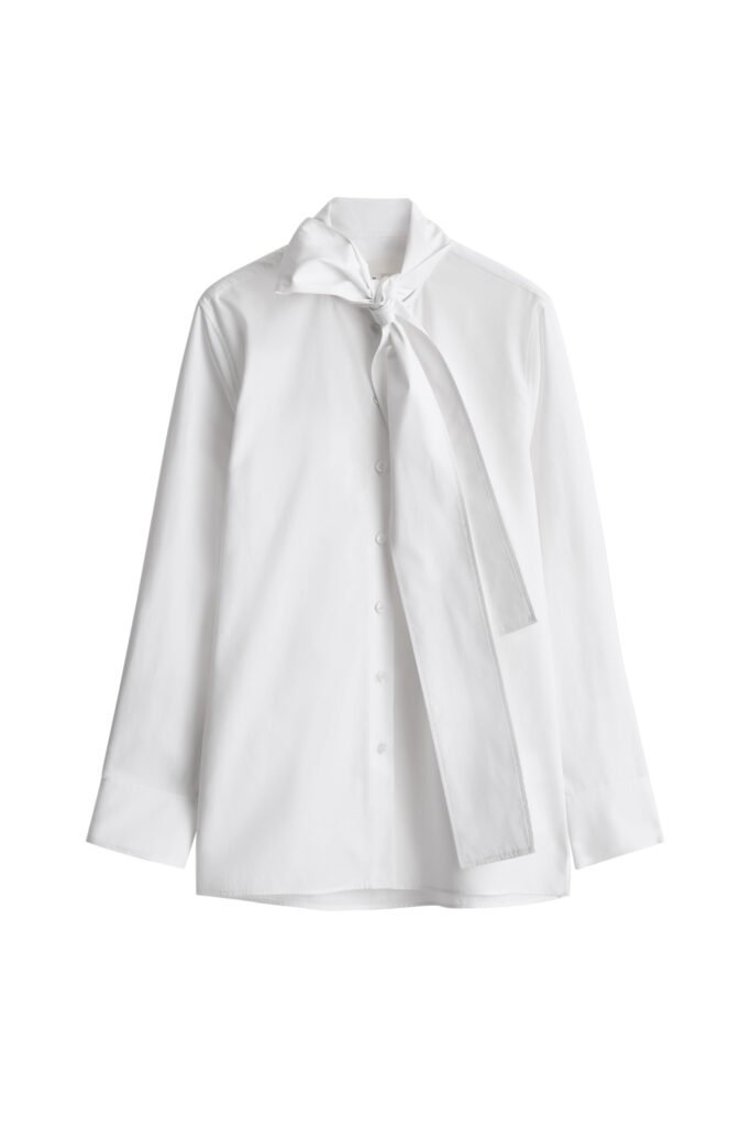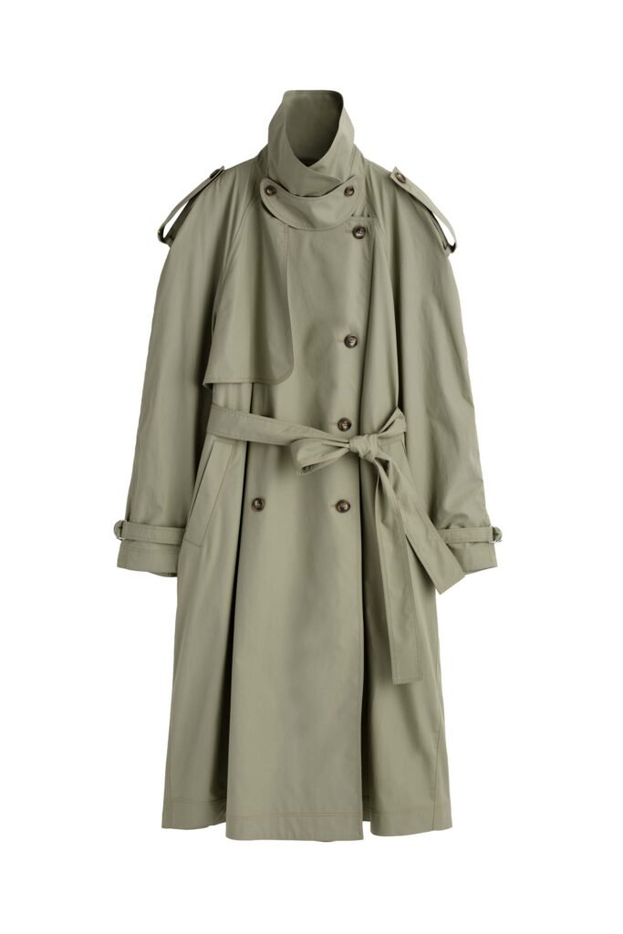 Drawing on the effortless elegance of 1980’s styling, the collection is defined by set dressing, statement outerwear and refined layering pieces. Tailoring sits at the core, as classic codes are reimagined through contemporary volume and proportion; strong shoulders and high necklines empower the wearer, while fluid silhouettes introduce understated ease. Outerwear anchors the collection, delivering both versatility and impact as the seasons shift. Trench coats lead the offering, featuring an oversized silhouette with a waist-defining belt. Menswear adds a herringbone Balmacaan coat, while a butter-soft leather aviator jacket is elevated with a stand collar and concealed fastenings. Utility and sportswear references appear in a jacket with oversized flap pockets.