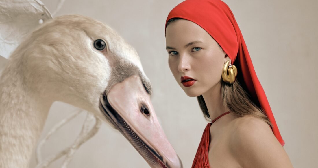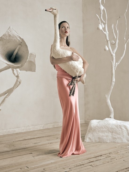 The campaign tells the story of a modern muse who wanders into a surreal sculpted dreamscape, where oversized swans, twisted pear trees, and abstract floral forms rise like porcelain relics from a forgotten tale.