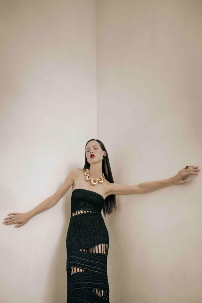 Each sculptural “gift” she encounters feels conjured from her imagination, echoing her own metamorphosis. Her gowns mirror the spirals and textures of the landscape, embodying both muse and maker—beauty as her language, refinement as her rhythm.