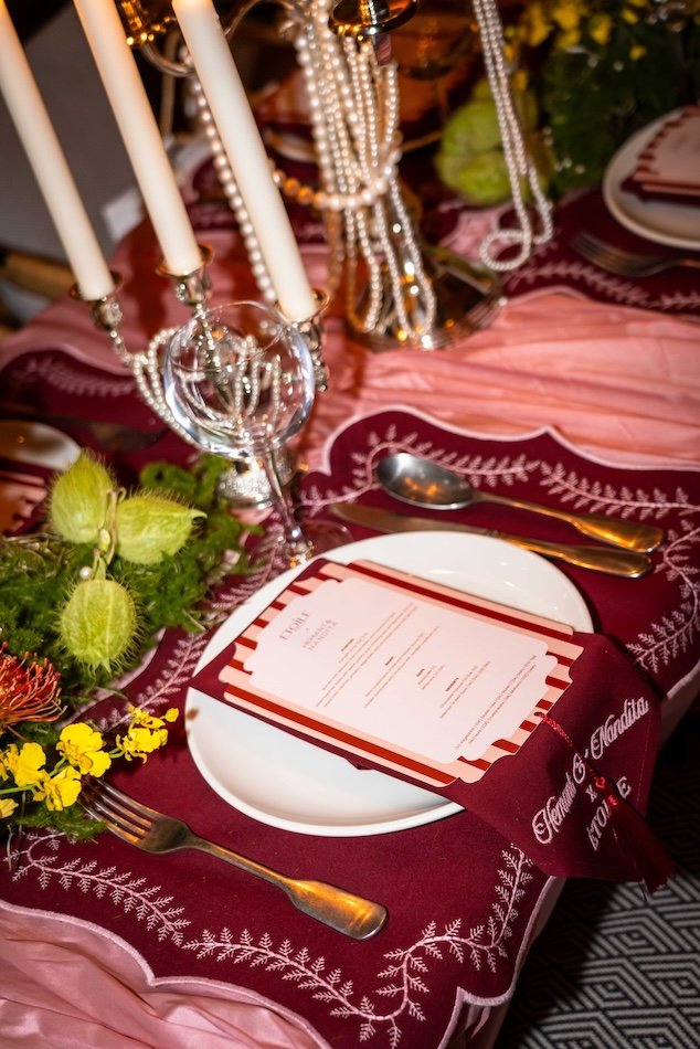 Set against the warm elegance of the venue, the evening’s décor subtly wove Indian elements with Hemant & Nandita’s signature prints, creating an atmosphere that felt both intimate and evocative. A Suhoor-style dining setting across custom Hemant & Nandita burgundy table linens, lending richness and depth to the tablescape. Floral arrangements, a poetic nod to the brand’s enduring love for botanical motifs, bloomed across the space while thoughtfully curated co-branded moments and a selection of key looks from the collection brought the world of Hemant & Nandita to life in an immersive and tactile way.
