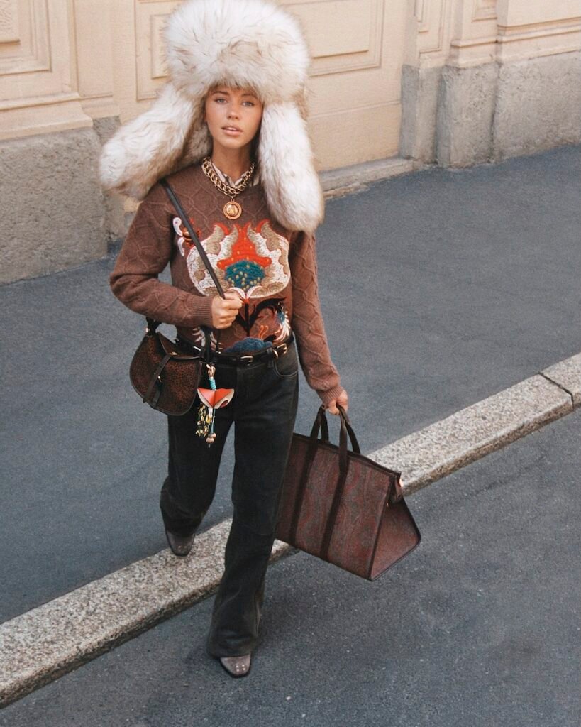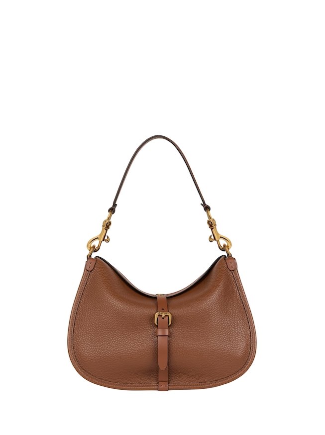Its shape revisits a 17th-century classic of Italian leather goods: the “cacciatorina”, once used by shepherds and farmers and now reimagined as a symbol of ETRO’s love for the 70s bohemian mood. The original rounded silhouette is restyled with a softer, more deconstructed vibe: proportions are completely reimagined, with a minimized flap closing at the top, and details including the Pegasus-embossed coin closure, the Paisley-accented carabiner, and the roller buckle inspired by the world of saddlery.