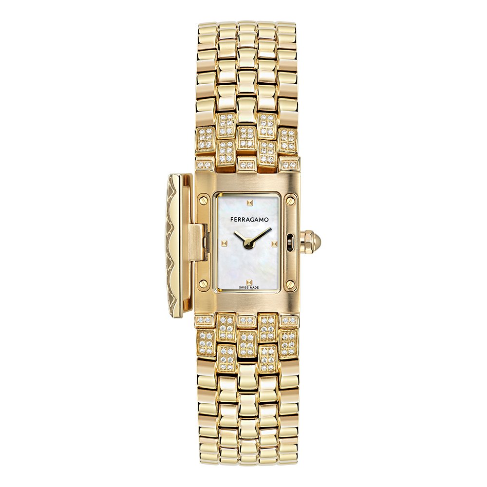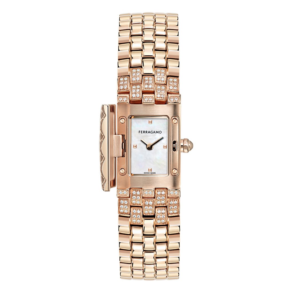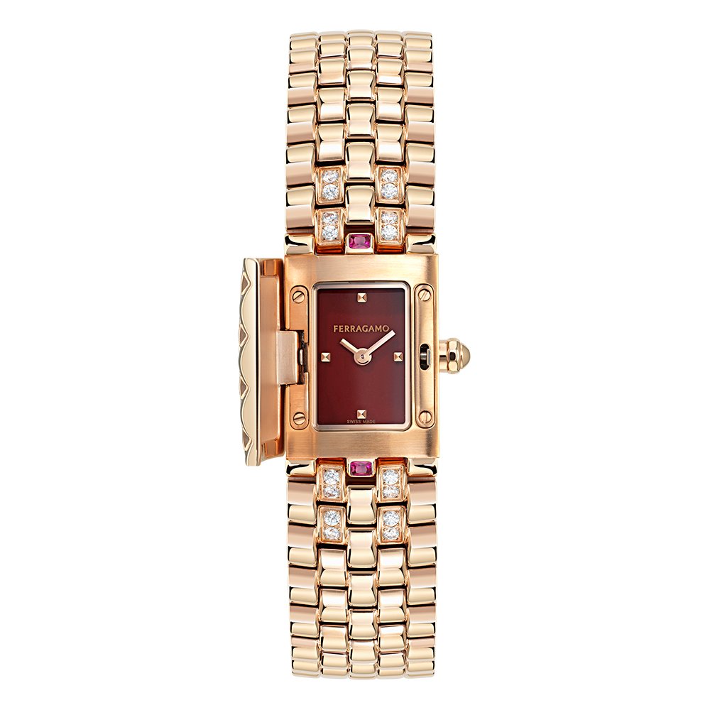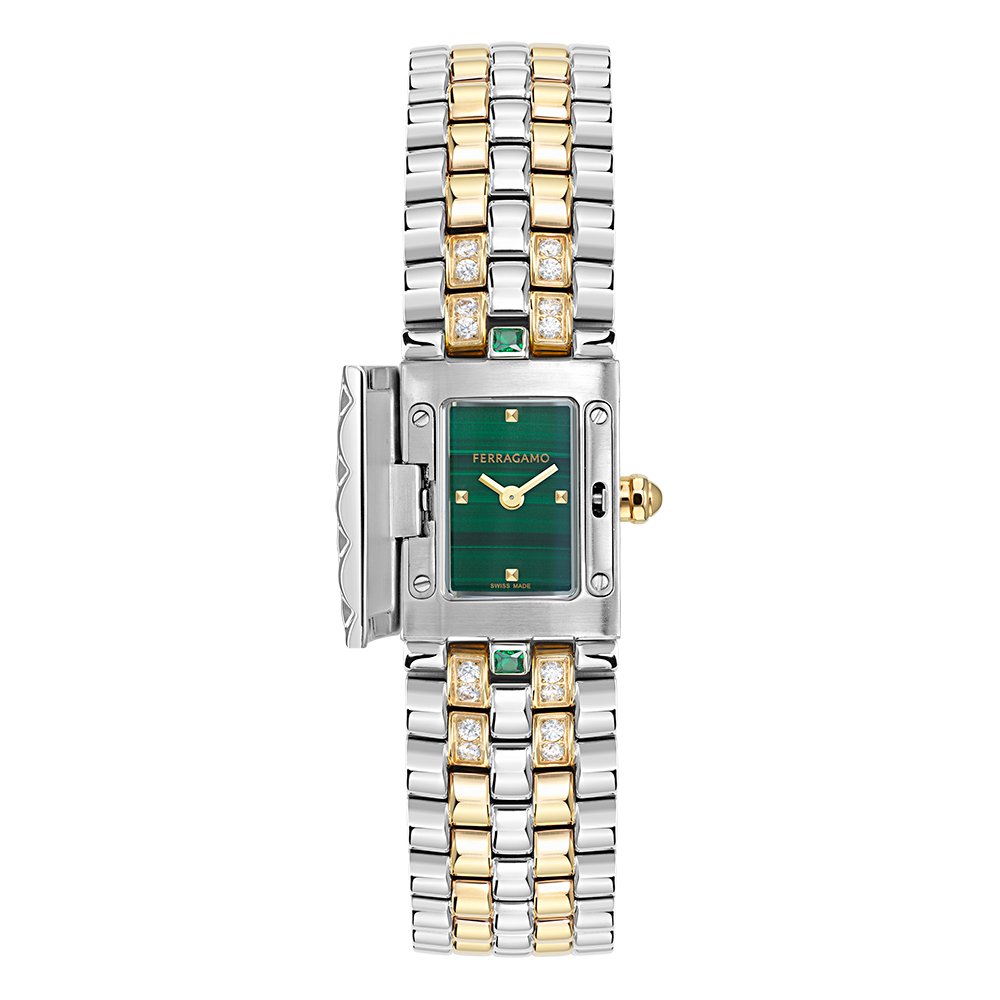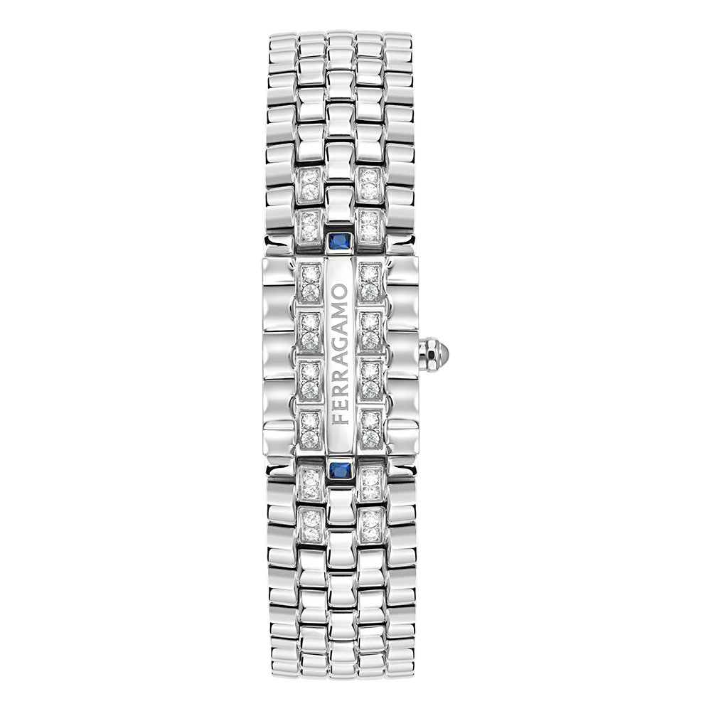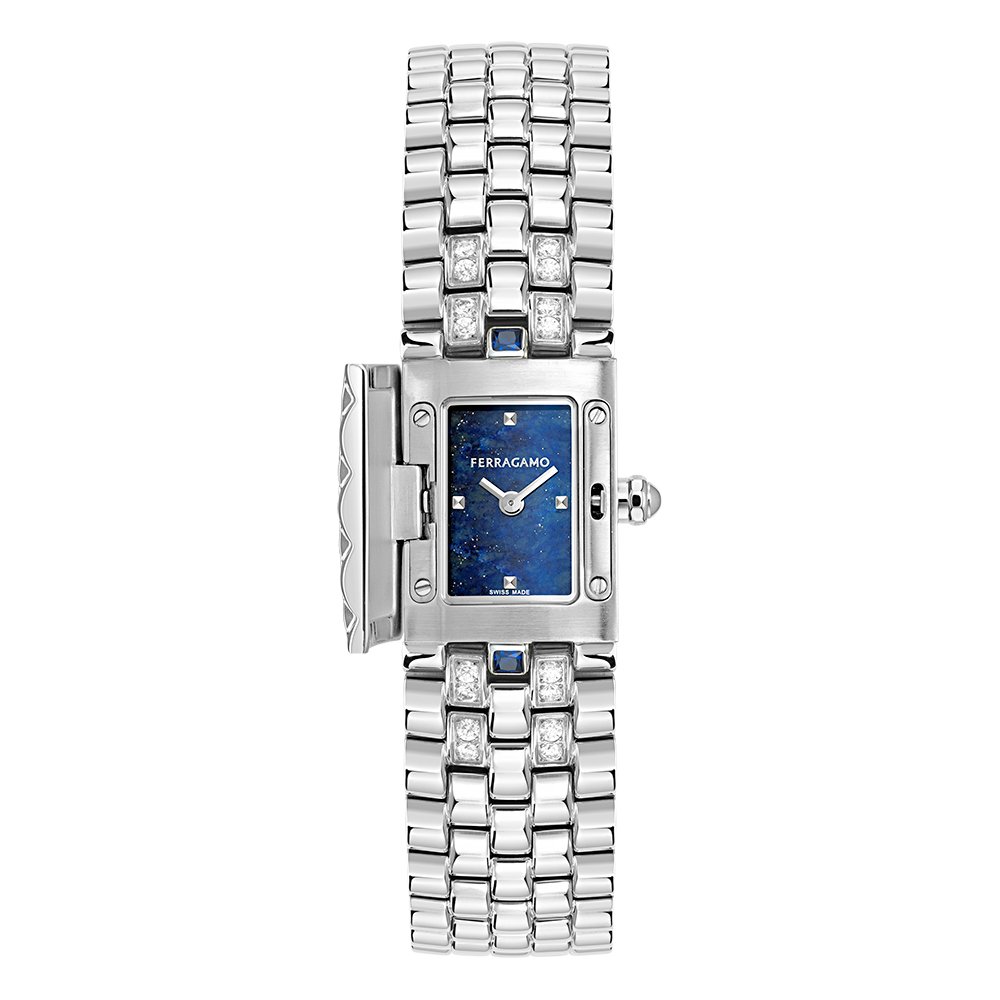 TECHNICAL INFORMATION ● Case: Rectangular, 18×30 mm ● Movement: 2 hands quartz (Ronda 1032) – Swiss Made ● Dial: 4 variations: lapis lazuli, malachite, red agate, and mother-of-pearl ● Bracelet: 2 variations: steel with 32 diamonds (0.96 ct) with square-cut blue sapphires, emeralds, or rubies; steel with 188 diamonds (0.85 ct) – butterfly buckle with Ferragamo logo ● Water resistance: 30 meters
