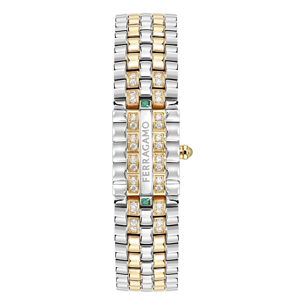 The meticulous craftsmanship of the five-link bracelet, echoed on the sliding panel engraved with the vertical Ferragamo logo, further enhances this design. The dial frame, hands, and small studs on the indexes recall the brilliance of the metallic finishes, reflecting a sense of aesthetic continuity between the watch’s exterior and interior.