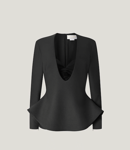From sharply cut peplum jackets to sculpted corsets and sheer ruched bodysuits, the collection exudes modern allure through architectural lines and refined textures. Each top is a standalone showpiece, pairing bold structure with sensual detailing, the kind of piece that transforms from dinner to the dance floor with ease.