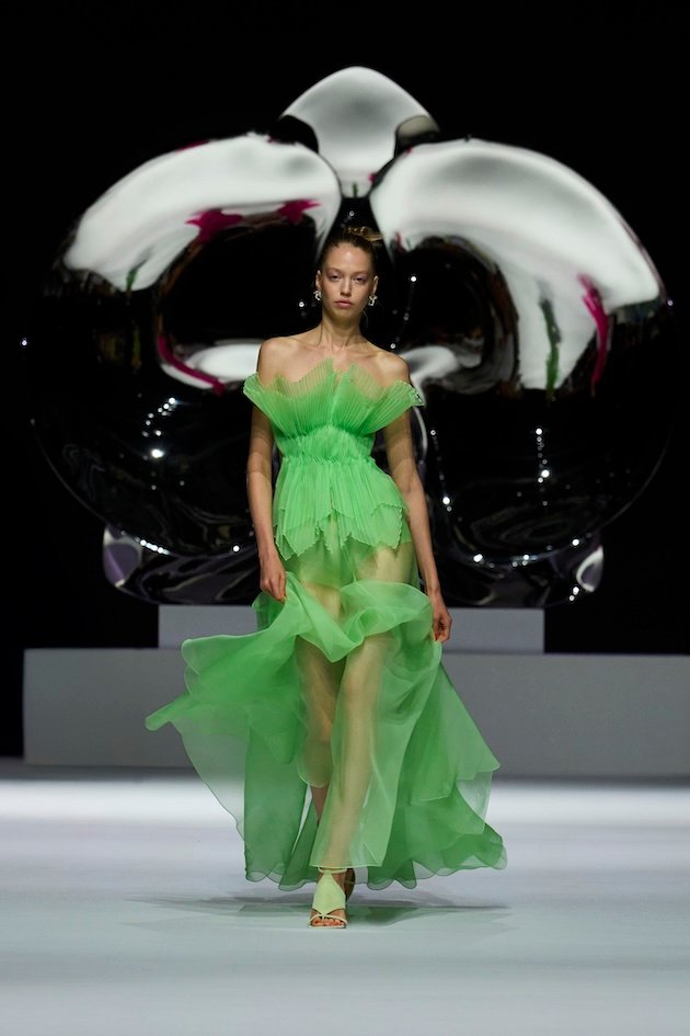 From this comes the idea of building the entire collection around a new concept of feminine curvature. The waves of the sea become the edges, collars, and cuffs of a sophisticated green gauze shirt, but also the hem of a delightful organza dress and new harem pants that dance freely around the ankle. The petals of the orchid bend, come to life, and open up in the complex constructions of organza bustiers to be worn over masculine trousers, or in a pure white bodysuit with a sculptural corolla around the décolleté. Stripes take on the role of the flower’s stem, while different kinds of pleats are interwoven with asymmetries and bias cuts for chiffon dresses, circular shapes for a trench-gilet, and animated hems in jersey or gauze garments.