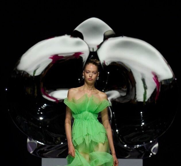 Inspired by the Phalaenopsis orchid, the emblem of Genny, and the artistry of Marc Quinn, whose work was featured on the runway, Sara Cavazza Facchini explores a kinship between the curves of its petals and the curves of women. In the outer edge of the corolla, one can see the rounded line of shoulders, while the bold descent toward the pistil, when viewed upside down, recalls the belly of the Mother Goddess.