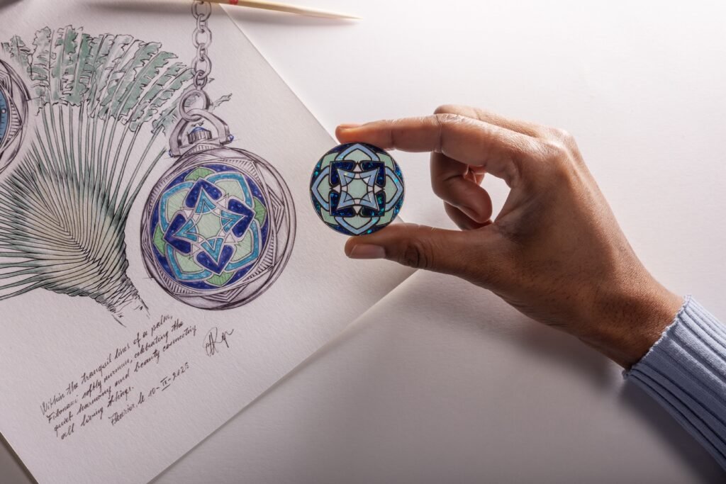 The motif, inspired by the geometry of the Traveller’s Palm, is not decorative in the usual sense. It translates the veins of the palm leaf into a pattern of equilibrium — a visual metaphor for the Golden Ratio that Michel Parmigiani considered the divine measure of beauty.
