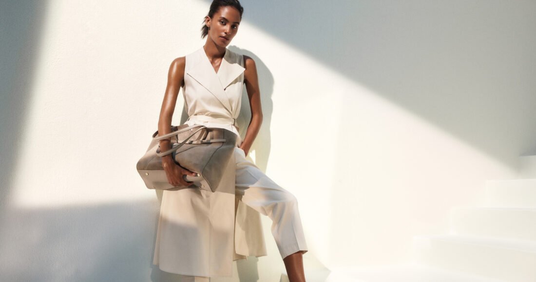 Trousers work a similar fluidity for Spring/Summer, as wide-leg styles take center stage. Key pieces include light-beige cargo trousers – available in lightweight crêpe or breezy linen blends – cut with clean, straight legs for a modern take on utility-inspired style. A pair of light brown high-rise, wide-leg trousers in a soft, slub-yarn textured wool blend, elevated with a built-in mini belt, also stand out in the edit.