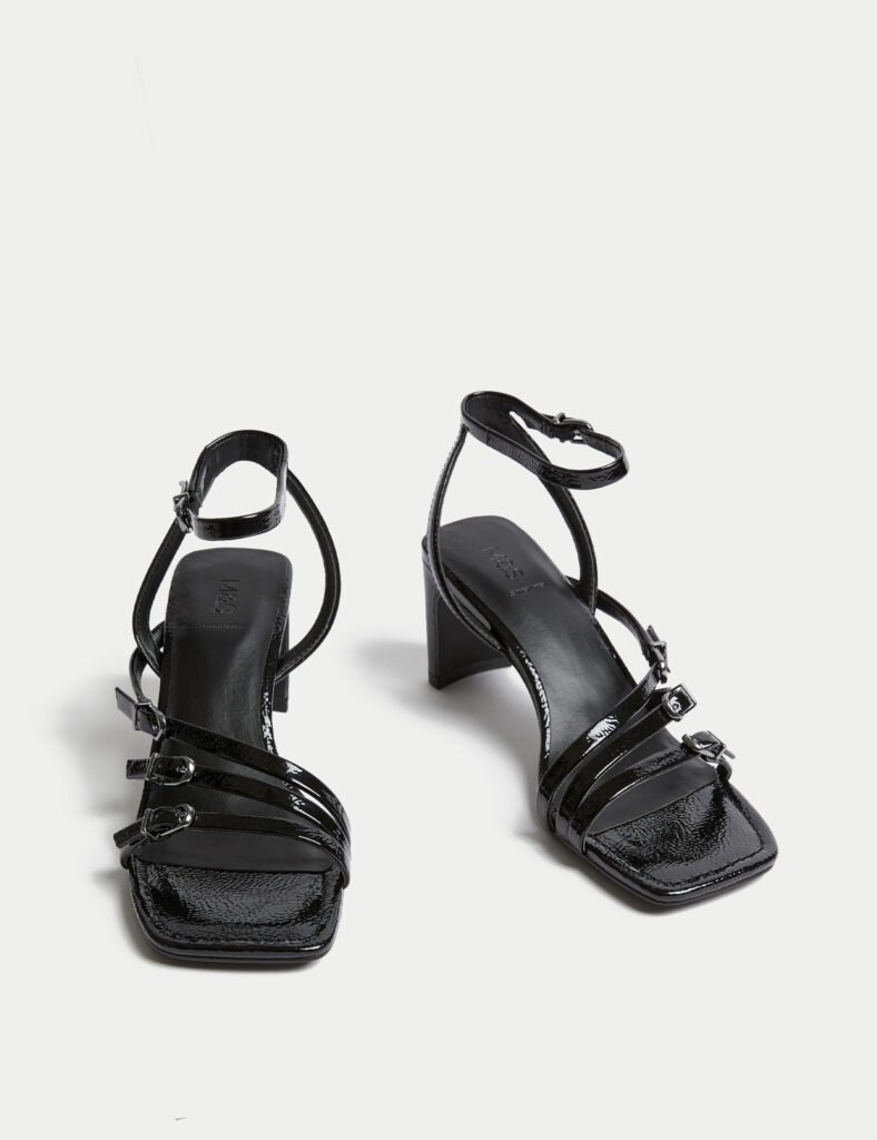 In footwear, explore an exciting combination of retro pieces, classic ballerinas, sleek micro boot heels with preppy loafers and combat lace-up boots for colder days. The Leather Buckle Strappy Block Heel Sandal adds a refined touch to any outfit with their sleek patent leather finish and Insolia® technology, which reduces pressure and improves stability.