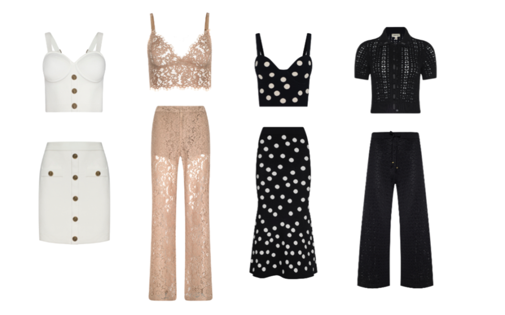Crafted sets define the collection, where sculptural silhouettes and coordinated pairings speak to modern glamour. Delicate lace and open-knit textures introduce softness, balanced by structured forms and a timeless monochrome palette. Polka-dot motifs add a subtle playfulness, while clean lines elevate each look.