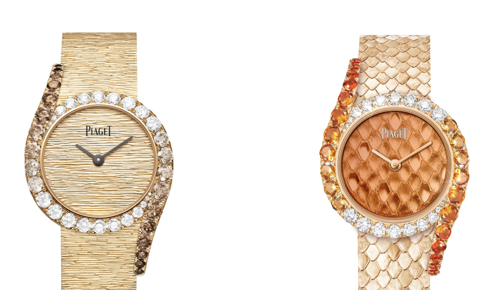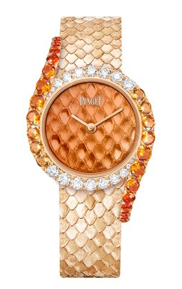 Now for spring 2026, Piaget launches two new Limelight Gala models: craving the spotlight, an extrovert flame-hued timepiece, its dial of vibrant orange Grand Feu enamel over gold engraved to replicate snake-skin, generously encircled in diamonds that flow around the circular case and spill over, curving and flowing into the rich sunset shades of spessartite garnets, on a bracelet of snake-skin engraved gold. This highly specialised recherché engraving technique, introduced in 2019 on the Extremely Lady watch, demands extreme skill and expertise, a tribute to the dedicated artisans of the House of Gold. The trompe-l’oeil effect of depth and texture mimics the sinuous, undulating scales of the reptile.