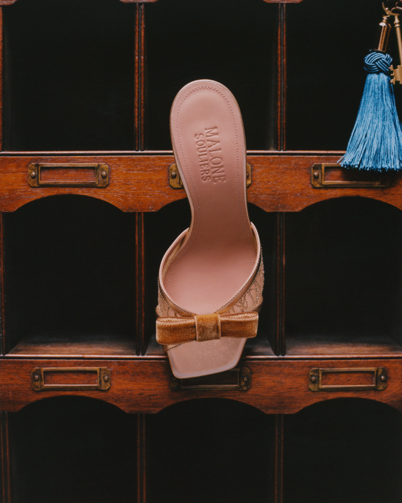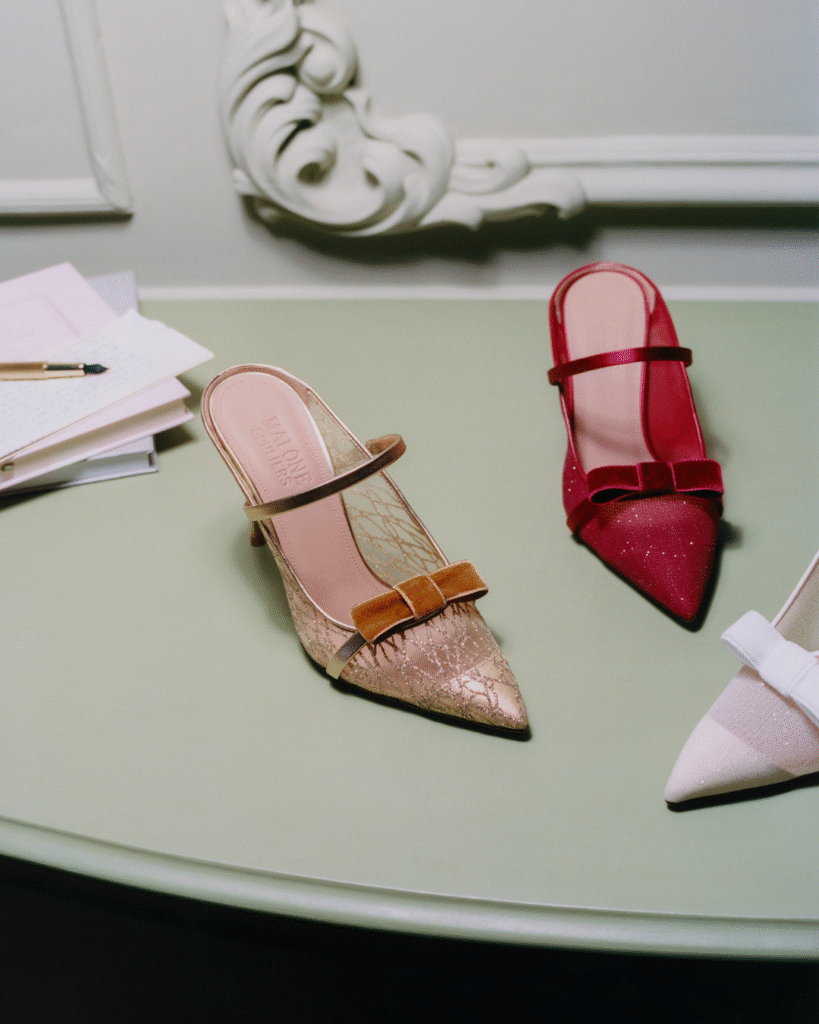The Holiday campaign, set in a traditional London hotel, celebrates the warm nostalgia and buzzing anticipation evoked by holiday travel, reflecting on the joy of seeing friends and family from different corners of the world during the festive period. The collection, built from sparkly mesh and adorned with velvet bows, is designed for the party season, with each style being a reimagined Malone Souliers icon, dressed up for holidays.