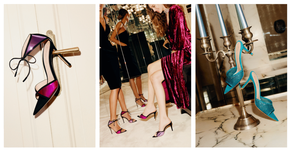 From the crystal-embellished Rania mules to the playful sparkle of the Confetti sandals, each design is crafted to catch the light with effortless sophistication. Jewel tones, mirrored accents, and delicate embellishment elevate timeless forms, creating shoes that feel both celebratory and enduring.