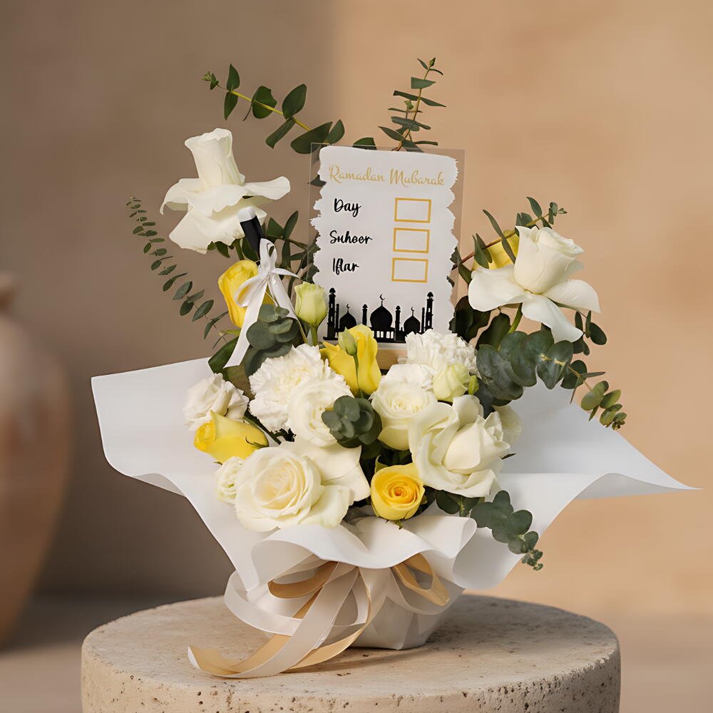 Thoughtfully designed to mark the sacred rhythm of the holy month, Hilal Countdown is a meaningful floral arrangement that blends beauty with tradition. Soft white and yellow blooms are paired with fresh eucalyptus and complemented by a Ramadan calendar, inviting moments of reflection from suhoor to iftar, a graceful centerpiece that celebrates time, intention, and togetherness.