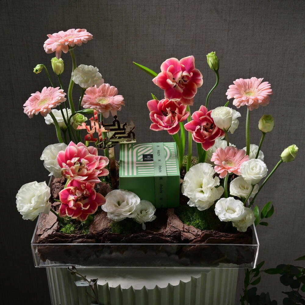This arrangement does feel like paradise: playful gerberas, rich tulips, and soft eustoma flowers are paired with a box of luxurious Patchi chocolates. Serene, elegant, and full of warmth, it’s made for sending heartfelt wishes this Ramadan — and blessing someone’s home with a beautiful touch.