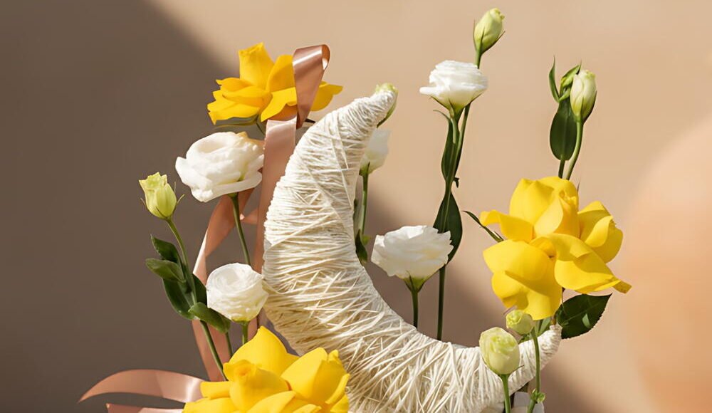 Soft white lisianthus and radiant yellow roses arranged with smooth pebble stones and a knotted moon accent. A bright, uplifting composition that brings warmth and calm to any space. A thoughtful way to share the spirit of Ramadan with someone special.