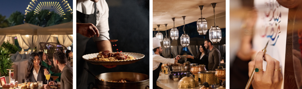 As the sun sets, Amaseena comes alive beneath the stars. Designed as an open‑air Arabian village, the venue blends traditional tents, earthy textures and soft lighting to create an atmosphere that feels both intimate and celebratory. Warm breezes, gentle décor inspired by Ramadan, and a crescent‑moon backdrop set the tone for evenings rooted in togetherness.