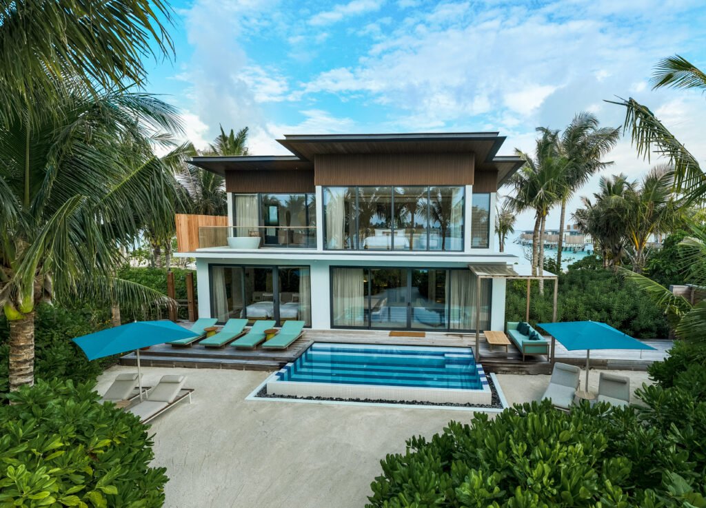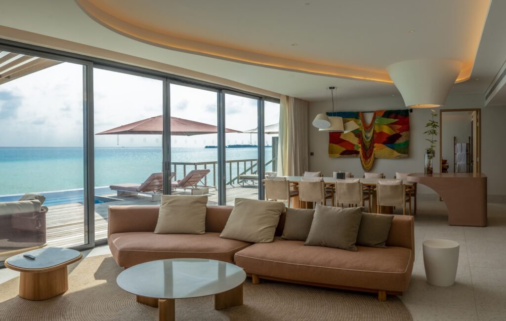 For Gulf families seeking a design-forward retreat, SO/ Maldives offers spacious residences that promise breezy island ease combined with sartorial elegance. The Two Bedroom Lagoon Beach Pool Loft opens directly onto white sand and crystal-clear lagoon waters. Spread over two levels, it features a separate living and dining area, sculptural details, and a statement cocoon tub with views across the reef. Families drawn to life above the sea may choose the Two Bedroom Ocean Water Pool Atelier with a wraparound terrace, private pool, and floor-to-ceiling glass framing the Maldivian horizon.