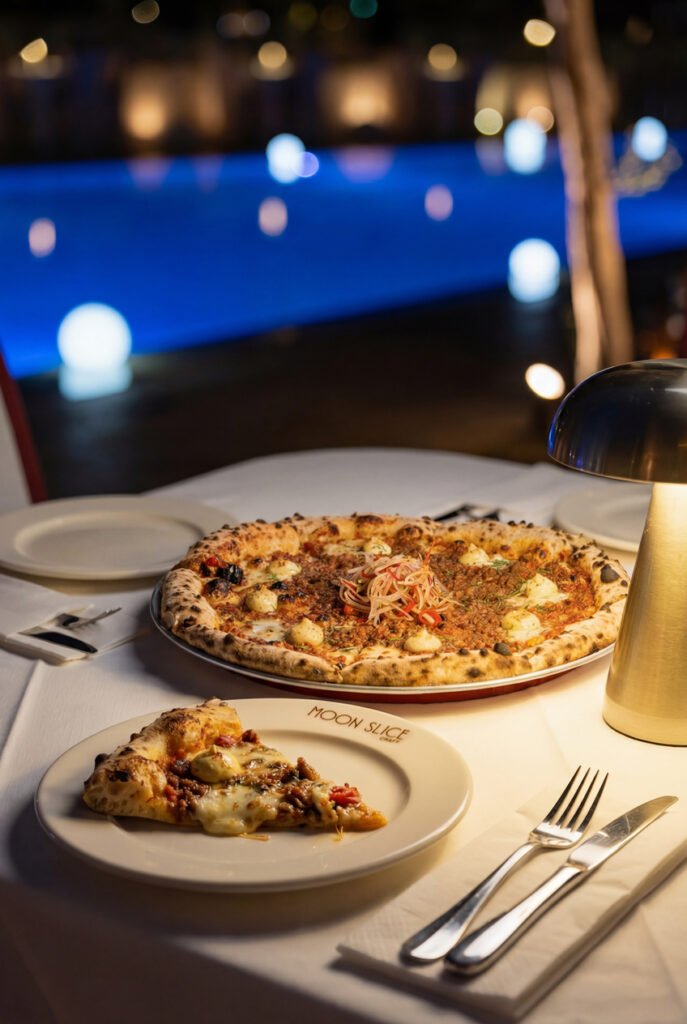 For a limited time, the pop-up collaboration with Moon Slice brings a late-night dimension to the property. Set poolside at Alba Terrace, the space transforms into a relaxed, open-air dining setting. Here, guests can settle into low seating beneath softly lit structures, with terracotta accents and candlelight shaping the atmosphere. The experience is informal yet considered, designed for slow evenings, where conversation, flavour, and setting come together with quiet cohesion.