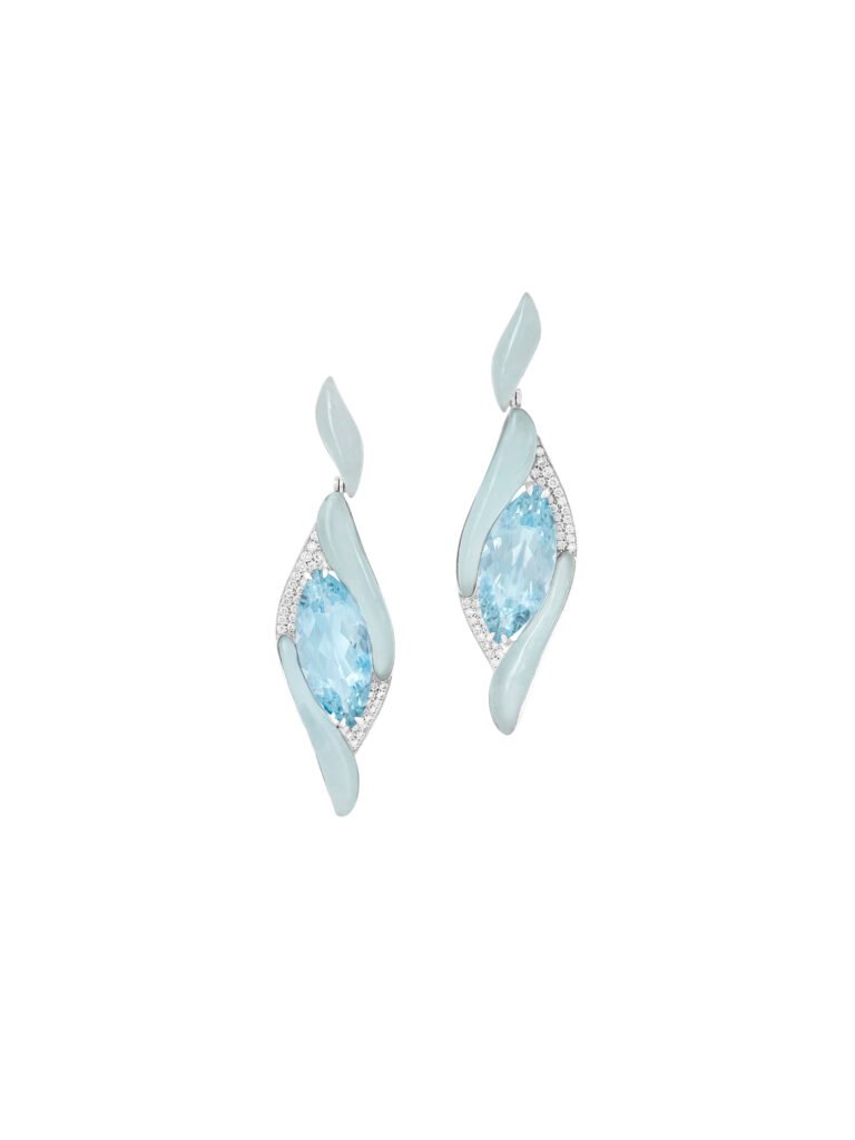 A pair of earrings showcasing two marquise-shaped aquamarines at their heart, enveloped by intricately sculpted flame-shaped milky aquamarine that ignite a graceful sense of movement.