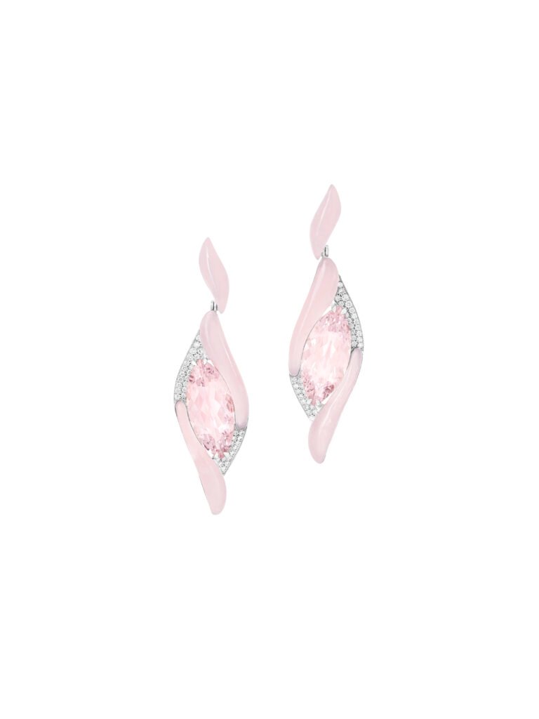 A pair of earrings showcasing two marquise-shaped pink tourmalines at their heart, enveloped by intricately sculpted flame-shaped pink opal that ignite a graceful sense of movement.