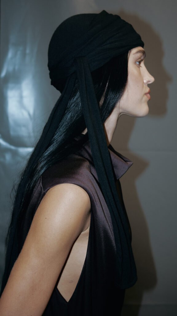 A separate and equally strong look includes a longline high-twisted technical wool overcoat combined with sharp, wide-leg, pleated utility trousers in a black coffee rigid cotton and a plush V-neck sweater in off-white raffia, designed with a voluminous silhouette. The notion of contrasts also bubbles up in a broad number of the looks featuring knit polos crafted from silk cotton, often styled as an undergarment or as the main layer under a coat or jacket.
