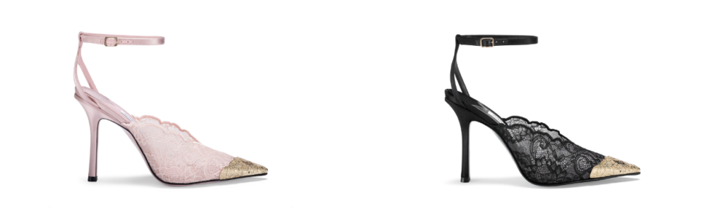The Faiz heel distills Jimmy Choo’s Spring 2026 mood into a single, refined statement. Intricate lace meets a gold-tone toe cap, balancing romance with a quiet sense of power. Each pair is meticulously embroidered over 18 hours — a subtle expression of the house’s devotion to craft. A delicate ankle strap frames the foot, while the sharp point lends a modern edge. Shown in Black and Rose, Faiz elevates every look with effortless elegance and assured boldness.