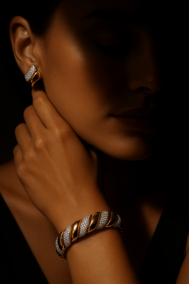 The Spiral Sparkle Diamond Bracelet complements the earrings with a bold yet refined design, combining polished gold with shimmering diamonds in a fluid spiral form. Worn alone or styled with evening wear, it makes a confident statement that feels perfectly suited to festive gatherings and celebratory nights.