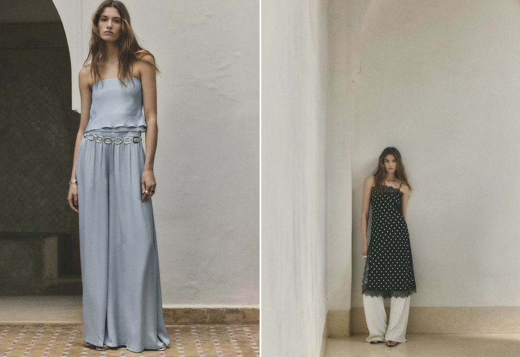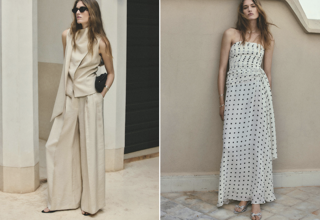 The formal event collection by Mango embodies contemporary elegance through a refined palette of black and white, contrasted with soft sky-blue tones. Polka dots take centre stage across long dresses, jumpsuits, suits, and coordinated sets, bringing personality to structured, formal silhouettes.