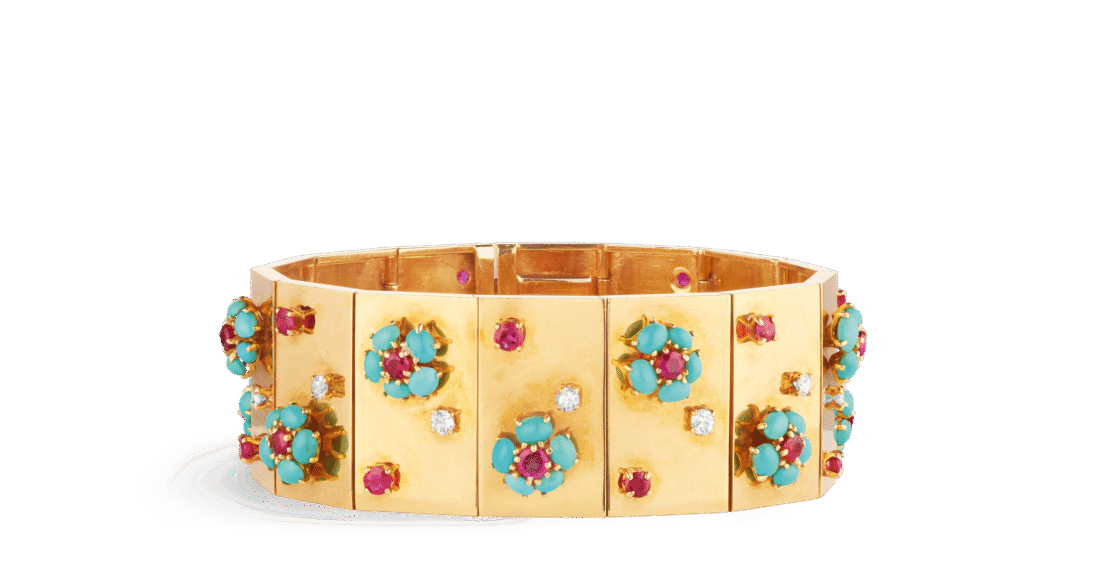 The exhibition highlights iconic creations such as the 1946 Three-bird clip symbolizing love and harmony, a 1950s floral clip adorned with turquoise and yellow gold, a 1972 beaded ruby necklace with detachable tassel influenced by Indian culture, and the 2008 Omikuji necklace from the Les Jardins High Jewelry collection, evoking Japanese gardens and traditions.
