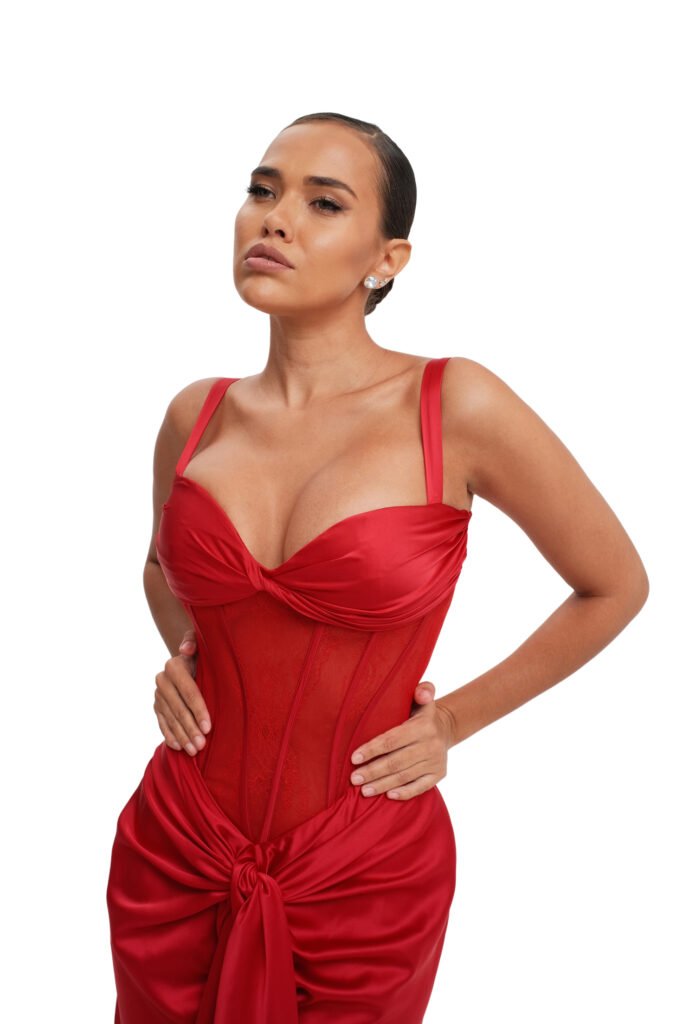 Leading the edit are two red statement dresses that set the tone for Valentine’s after dark. The Meet Me There Corset Dress is dramatic, confident, and impossible to ignore. Finished with matching gloves, it turns an entrance into a moment. This is the dress you wear when you want to be noticed without explaining yourself. It doesn’t whisper. It holds the room.