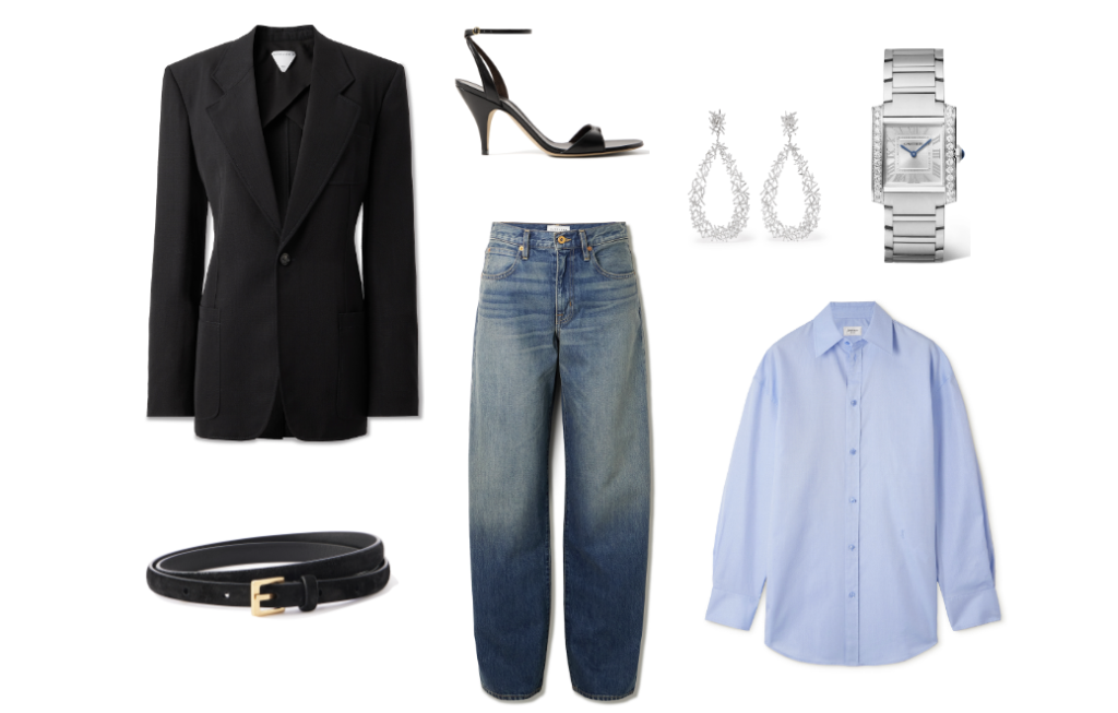 Bottega Veneta Blazer, The Row Belt, The Row Sandals (coming soon), Slvrlake Jeans, Suzanne Kalan Earrings (coming soon), Cartier Watch, Saint Laurent Shirt