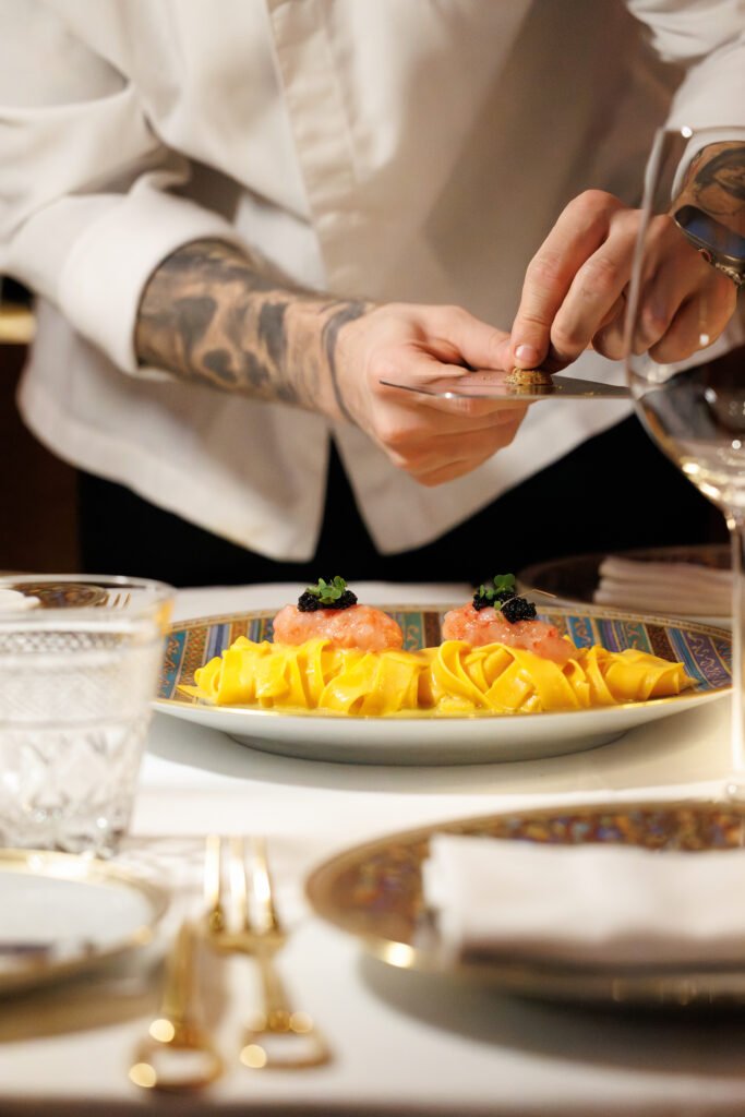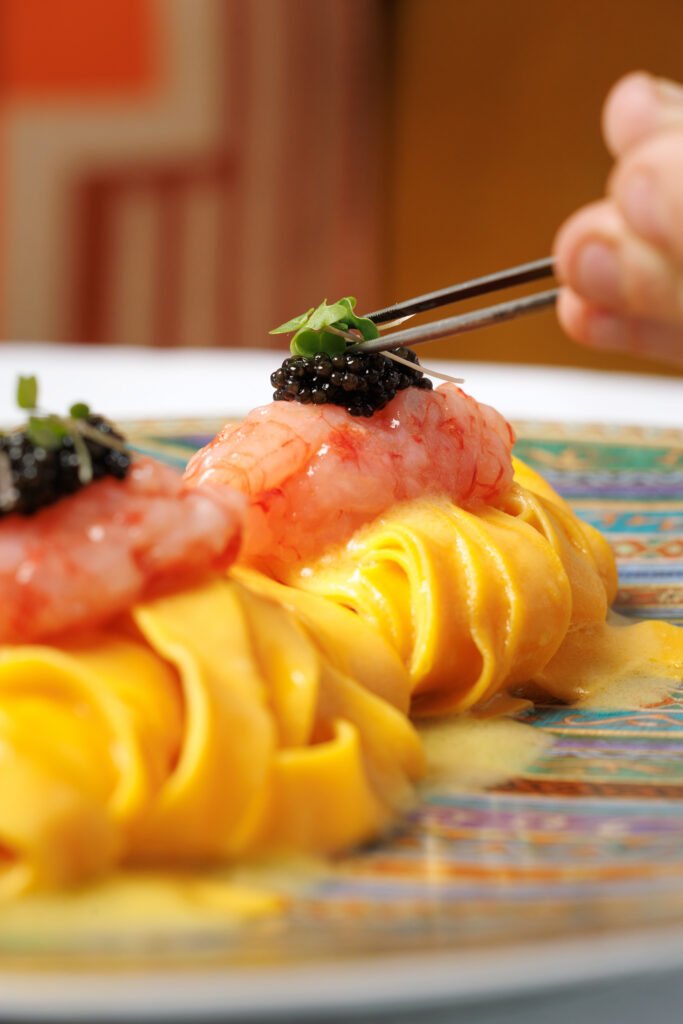 • Handmade Fettuccini Pasta with Red Prawn Tartare and Truffle Butter Emulsion